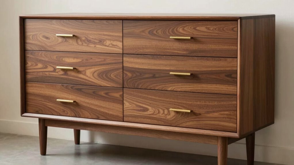 Choosing a solid wood mid-century dresser means prioritizing material quality and durability, as these factors directly influence its longevity and performance. The type of wood, like hardwood versus softwood, plays a key role in strength, stability, and resistance to wear. Well-crafted dressers often feature reinforced joints and high-quality hardware, which boost durability and lifespan. The finish used on the wood also matters; a good finish protects against scratches, moisture, and UV damage, helping the piece last longer. Proper maintenance, such as gentle cleaning and avoiding excess moisture, is essential to keep the dresser looking and functioning its best over time. When you select a high-quality, durable piece, you’re investing in furniture that will serve you well for years to come.