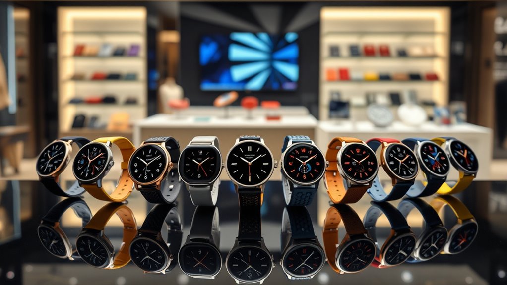 In 2025, the top fashion smartwatches blend sleek design with advanced tech features like vibrant touchscreens, customizable faces, and stylish embellishments, making them perfect for any outfit. They offer extensive health and fitness tracking, seamless connectivity, and long-lasting batteries. Whether you prefer elegant rhinestone accents or sporty designs, there’s something for everyone. Want to discover which models stand out for style and smart features? Keep exploring to find the best options for your lifestyle.