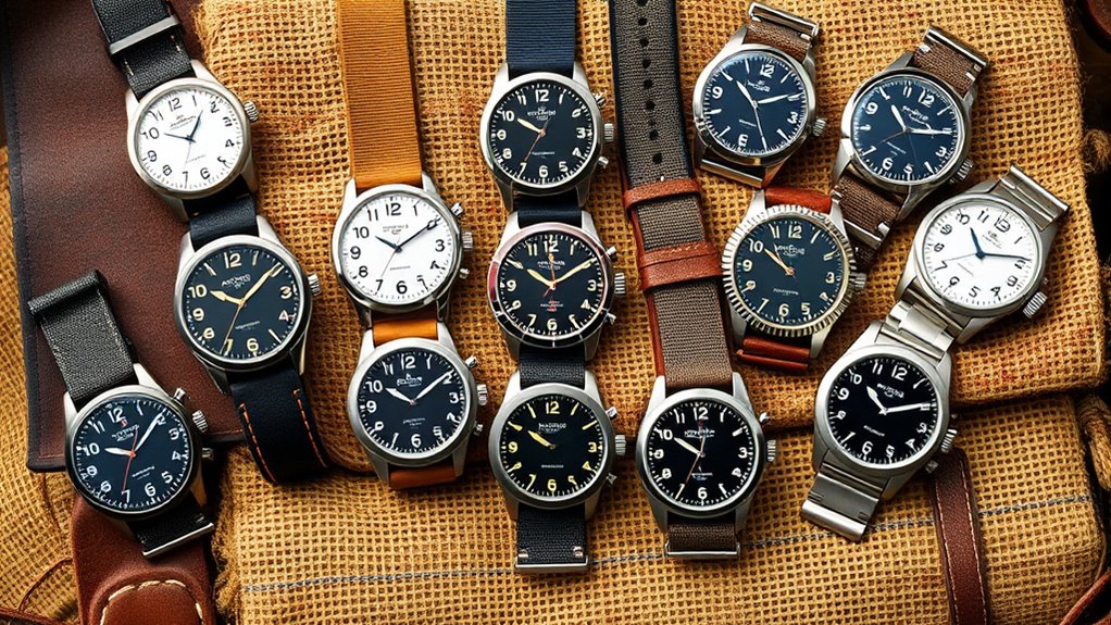 When hunting for a field watch under $300, it’s important to recognize that you’re getting a lot of bang for your buck. These watches combine durable materials, reliable quartz or automatic movements, and practical features without breaking the bank. Many models offer water resistance up to 100 meters, scratch-resistant sapphire crystals, and easy-to-read dials, maximizing functionality at an affordable price. The budget-friendly nature of these watches also means you can experiment with styles and customize straps without significant extra costs. In fact, some models rival higher-end options in build quality and performance, often exceeding expectations for their price. Plus, features like solar or automatic movements can save you money long-term by reducing the need for frequent battery replacements.