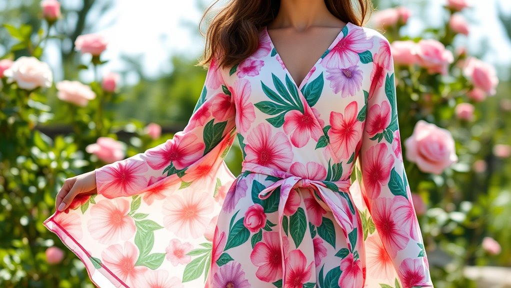 Choosing the right fabric is essential for guaranteeing your floral wrap dress feels comfortable and breathable throughout the day. Fabrics like cotton, linen, chiffon, rayon, and polyester blends are popular because they’re lightweight, soft, and allow air to circulate. Breathability is key, especially in warm weather, as it helps keep you cool and dry. Natural fibers such as cotton and linen excel in this area, offering superior airflow. The fabric’s weave also matters—a looser weave lets more air in while still providing coverage. Additionally, moisture-wicking fabrics are great for hot days, as they draw sweat away from your skin, preventing discomfort. Prioritizing breathable, comfortable fabrics ensures you stay fresh and confident, no matter the season or occasion.