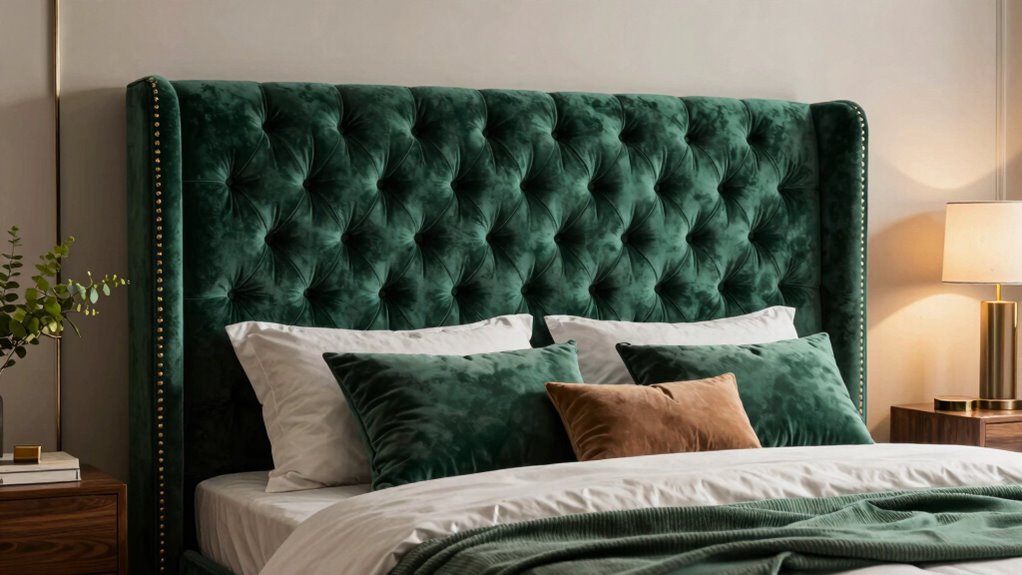 Choosing a durable headboard starts with understanding the materials used, as they directly impact how well the piece holds up over time. Solid woods like oak or maple are excellent choices because they resist wear, tear, humidity, and sunlight better than particleboard or low-quality textiles. Upholstered headboards with tightly woven fabrics and strong stitching tend to last longer, showing fewer signs of damage. Metal frames should be corrosion-resistant, especially if you live in a humid environment, to maintain their structural integrity. Additionally, opting for stain-resistant and easy-to-clean fabrics can markedly extend the lifespan of upholstered headboards. By selecting high-quality, resilient materials, you guarantee your headboard remains both attractive and functional for years to come.