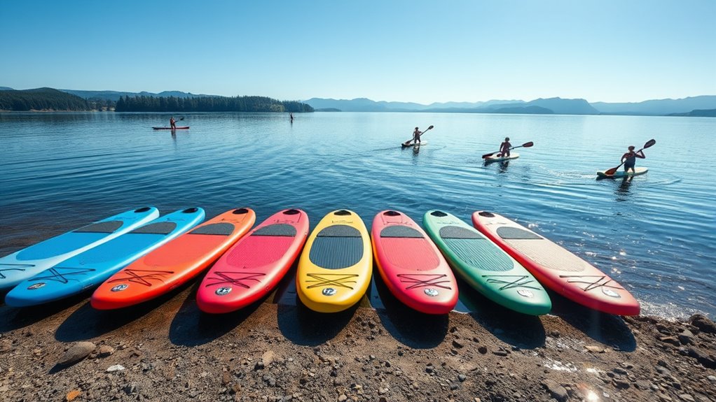 Durability guarantees your inflatable paddle board can handle rough water and impacts, but portability determines how easily you can carry and store it between adventures. When choosing a board, consider its weight—ultra-light models around 13.5 lbs are a game-changer, fitting into compact backpacks that make transport effortless. Look for sturdy, high-denier cases, like those made from 1680D fabric, to assure long-term protection. The ability to quickly deflate and roll the board into a small, manageable size—similar to a duffle bag—adds convenience. Multiple handles at strategic points help with carrying, especially for remote locations. Also, check if the pump and accessories enable rapid inflation and deflation, reducing setup and pack-up time, which substantially enhances overall portability and storage ease.