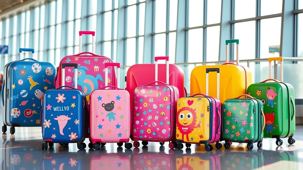 Selecting the right size and weight for kids’ luggage sets guarantees that children can easily manage their bags without feeling overwhelmed. Make sure the luggage complies with airline cabin restrictions, usually around 22 x 14 x 9 inches for carry-ons, to avoid issues at the airport. Choose lightweight options, often between 1 and 4 pounds, so kids won’t feel strained while carrying or rolling their bags. For younger children or those with limited strength, smaller dimensions make handling easier. Always check the manufacturer’s weight limits to ensure the luggage can hold essentials without becoming too heavy. The goal is to find a balance that allows your child to transport their belongings comfortably without exceeding their physical capability.