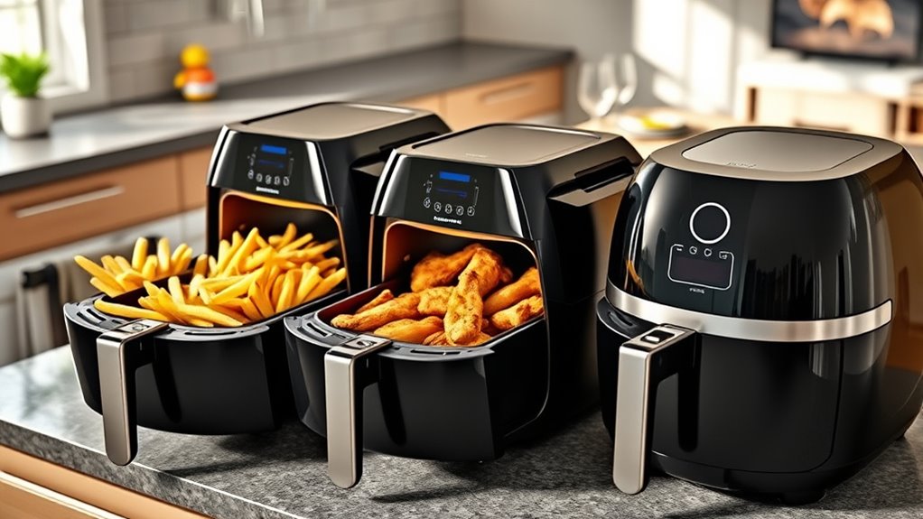 Choosing the right large-capacity air fryer is like finding the perfect family recipe—it’s all about balance and fit. With options like Emeril’s French door design or Ninja’s versatile models, you’re equipped to create delicious meals for everyone. Imagine your kitchen as a bustling hub of flavor and togetherness, where these air fryers turn everyday cooking into a delightful celebration. So, pick the one that feels like it was made just for your family’s story.