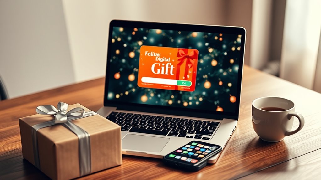 Personalization options can substantially boost the emotional impact of last-minute digital gifts, making them feel more thoughtful and tailored to the recipient. Many digital gifts offer easy customization through user-friendly websites or apps, allowing quick uploads of photos or videos and simple edits. You can select specific themes, covers, or backgrounds to match the recipient’s tastes or the occasion. Adding personal touches like names, special dates, or heartfelt messages transforms a generic gift into something meaningful. This rapid customization capability makes personalized digital gifts perfect for spontaneous giving without sacrificing thoughtfulness. They show you put effort into the gift, even at the last minute, and help create a memorable moment for the recipient. Personalization truly elevates the value of digital gifts in a flash.