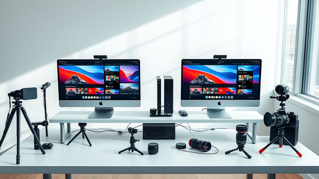 Think of your storage as the backbone of your photography workflow. I recommend using a combination of fast SSDs and cloud storage. SSDs, especially external Thunderbolt drives, speed up editing and rendering, while cloud options like iCloud or Dropbox provide seamless backup and access from anywhere. This setup keeps your projects flowing smoothly, like a well-oiled machine, so you spend more time creating and less time waiting.
