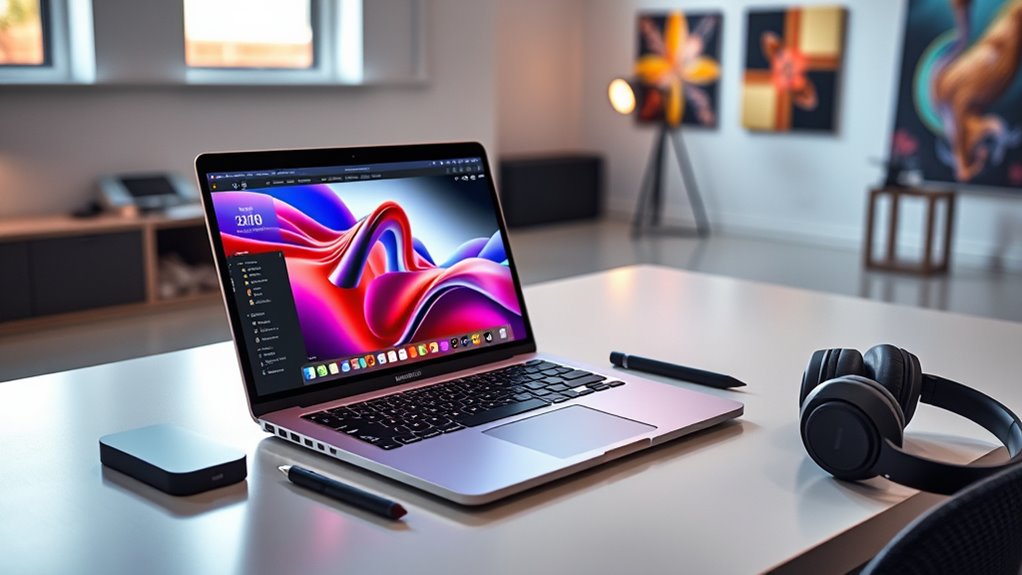 Choosing a MacBook Pro for 3D modeling and VFX hinges considerably on its processing power and core count. Higher core counts in both CPU and GPU enable faster rendering and smoother workflow, especially when managing complex scenes. Multi-core processors allow me to multitask efficiently, running demanding applications without lag. Hardware acceleration features, such as ray tracing and dedicated media engines, markedly cut rendering times and enhance real-time effects. A robust GPU with many cores improves viewport navigation and GPU-accelerated rendering tasks, making my work more responsive. Ensuring sufficient CPU and GPU cores is essential for handling large scene files, detailed textures, and high-resolution outputs without bottlenecks. Ultimately, prioritizing processing power and core count elevates performance and productivity in demanding 3D and VFX projects.