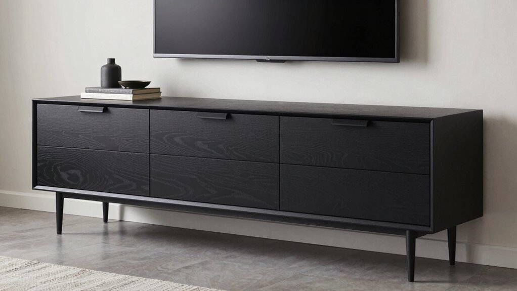 Ensuring safety features are in place is just as important as considering style and functionality when choosing a media console with drawers. Look for models equipped with anti-tip hardware to prevent tipping accidents, especially if you have children or pets. Soft-close drawers are a smart addition, reducing the risk of pinched fingers and minimizing noise during use. Child safety locks or latches on drawers and cabinets help secure hazardous items, keeping little ones safe. Opt for furniture with rounded edges and corners to lessen injury risks from bumps. Finally, verify that the console complies with relevant safety standards and certifications, ensuring it meets safety regulations. Prioritizing these features gives you peace of mind and creates a safer environment in your home.