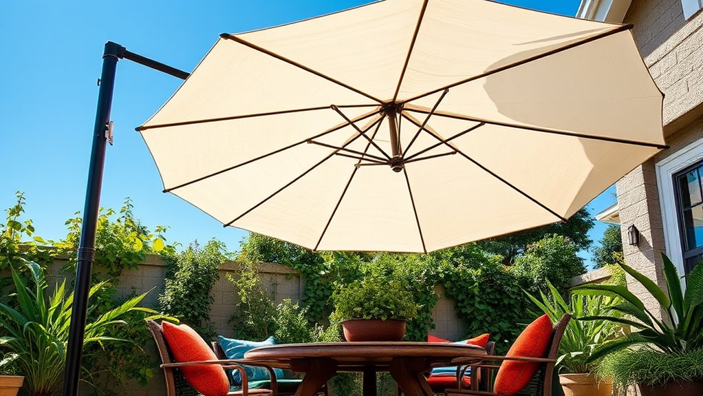 Adjustability and tilt features substantially enhance the functionality of patio umbrellas by allowing you to modify the canopy’s angle to block the sun more effectively as its position changes throughout the day. Many umbrellas come with tilt mechanisms, like push-button or crank systems, making it easy to adjust the angle without disassembly. Some offer multiple fixed tilt angles, while others provide infinite tilt options for precise positioning. This flexibility helps you stay shaded during different times of the day, increasing comfort and sun protection. Additionally, multi-directional tilt options enable all-encompassing coverage from various angles, ensuring you can adapt to changing sunlight. Overall, these features make your outdoor space more comfortable and versatile, especially when enjoying extended periods outside.