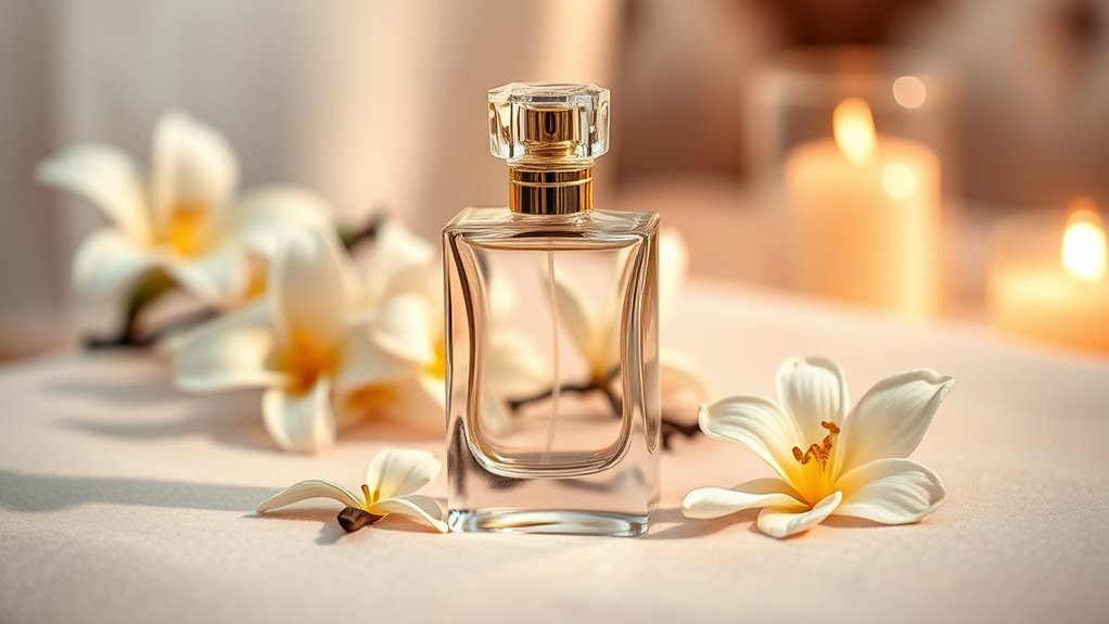 Understanding fragrance notes is essential when choosing a perfume, as each layer—top, heart, and base—evolves over time to create the overall scent. Top notes are the initial impression, light and fleeting, lasting only minutes. They set the first mood of the perfume and often include citrus or herbal scents. Heart notes emerge after the top notes fade, forming the core character of the fragrance with floral or fruity aromas. These define the scent’s personality during its middle phase. Base notes provide depth and longevity, lingering longest on the skin. Common base ingredients like vanilla, musk, or woods add richness and warmth. Knowing how these layers interact helps you select a perfume that matches your personal style and desired wear duration, ensuring a scent that truly resonates.