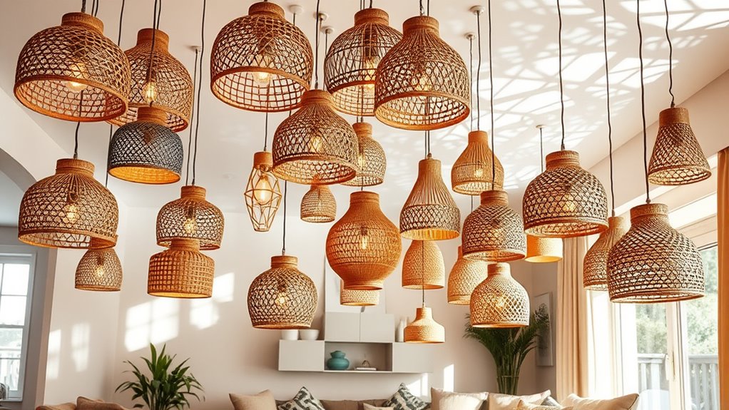 - Rattan pendant lights create a warm, inviting glow with natural woven textures, enhancing cozy interior atmospheres.