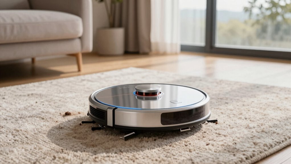 Imagine your robot vacuum gliding smoothly over your carpet, like a gentle breeze smoothing out wrinkles. To keep it performing at its best, I recommend maintaining it every one to three months. Regularly empty the dustbin, clean the brushes, and check the filters. This routine guarantees your vacuum stays efficient, deep-cleaning your carpets and keeping them fresh, just like new. Consistent care makes all the difference for lasting performance.