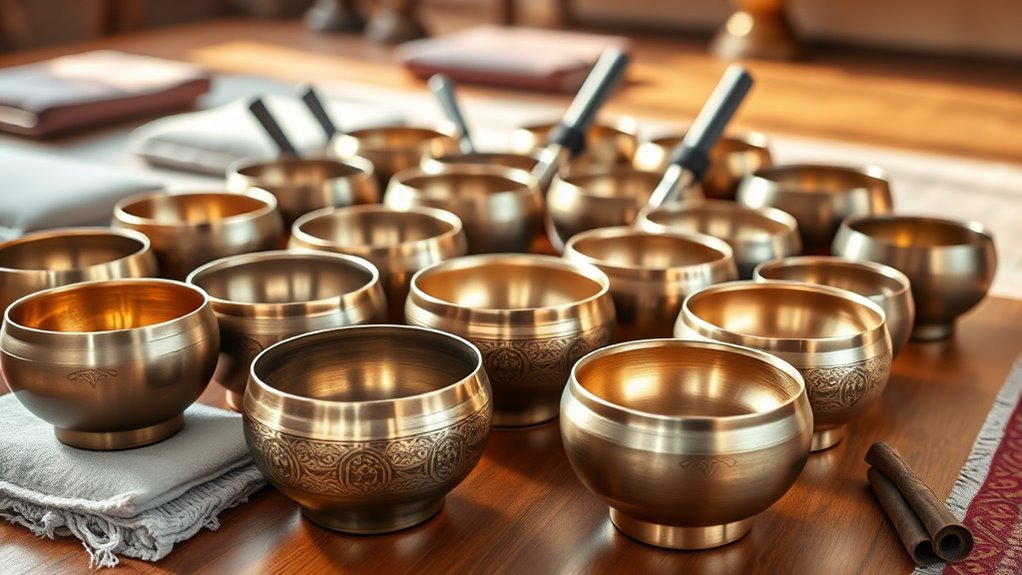 A well-equipped singing bowl set often comes with essential accessories like mallets, O-rings, and cushions that make playing easier and protect the bowls from damage. The right mallet—whether suede, rubber, or wood—can influence sound quality and ease of use. O-rings help stabilize the bowls during play, preventing vibrations from causing harm or noise disruptions. Cushions provide a soft surface, reducing the risk of scratches and cracking. Many sets include carrying cases or bags, essential for safe transport and storage, especially if you travel or perform professionally. These cases safeguard your investment and keep accessories organized. Overall, high-quality accessories and protective cases not only enhance your experience but also extend the lifespan of your singing bowls, making them a valuable addition to any set.