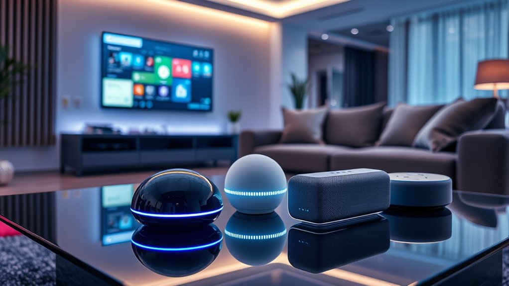 Smart home assistants equipped with advanced voice features can considerably enhance how you interact with your smart devices. I look for assistants with natural language processing, so I can speak naturally and get accurate responses, even for complex commands. Multi-language recognition is a game-changer for me, as it allows seamless switching between languages, making the assistant more accessible. Customizable wake words add a personal touch, letting me activate my device with a phrase I prefer. Integration with other smart devices means I can control lighting, thermostats, and security systems effortlessly through voice commands. Regular software updates are essential—they improve recognition accuracy, expand functionalities, and strengthen privacy. Choosing an assistant with these features ensures a smooth, intuitive, and secure smart home experience.