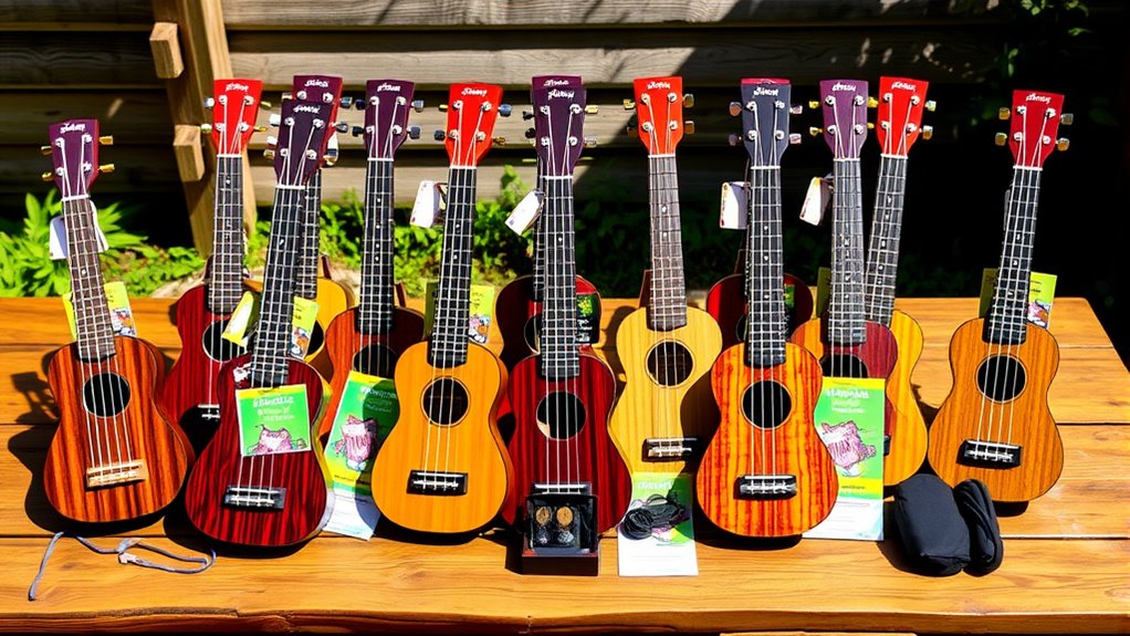 If you’re starting your ukulele journey, I recommend exploring top kits like Kala’s soprano starter with lessons, Kmise’s professional mahogany model, and Donner’s tenor bundles—all come with quality materials and beginner-friendly features. These kits include essential accessories and valuable lessons that make learning easier. Smaller sizes like soprano are perfect for portability, while larger ones offer richer sound. Keep exploring to find out more about these great options and what suits your style best.