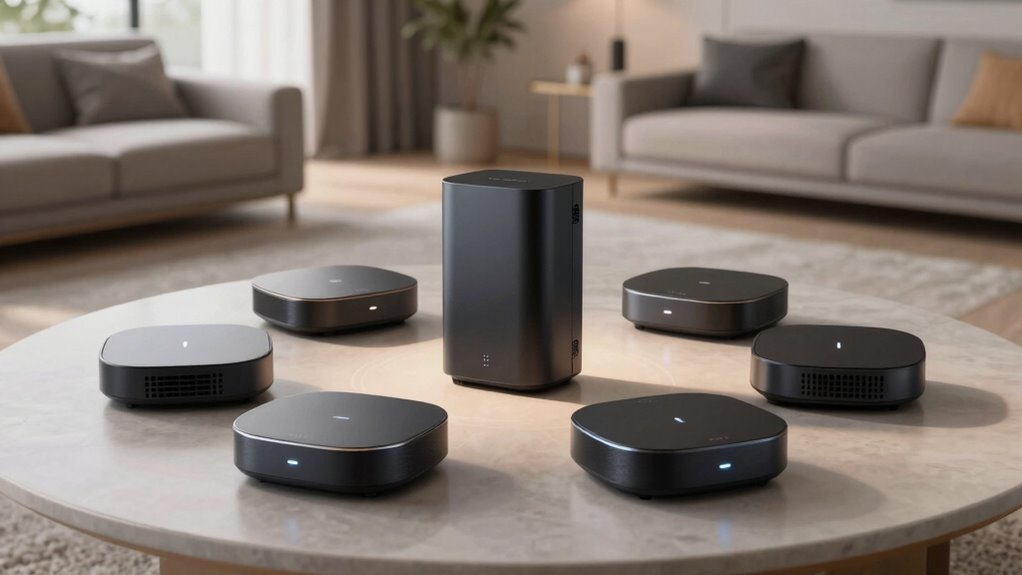Choosing the right WiFi 6E mesh system is like assembling a symphony—every piece must work in harmony for peak performance. With options ranging from TP-Link’s reliable Deco series to ASUS’s advanced ET9, you can find a setup that fits your needs and budget. Remember to take into account coverage, speed, and device compatibility. Investing in the right system guarantees your home’s WiFi is as seamless and powerful as a well-conducted orchestra.